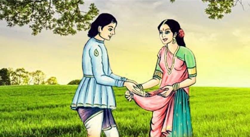 ખેતરમાંથી નાનો ભાઈ ખબર મળતાં હરખથી ઘેર આવ્યો. પણ બહેનને આપવા જેવું કંઈ નહોતું. આથી તે ઉદાસ બની વિચારે ચઢ્યો. આ મનોભાવો બહેની સમજી ગઈ. તે તુરત બોલી : ‘તેં હેતે આપેલો પૈસો મારે મન લાખ રૂપિયા સમાન છે. કમોદ શા કોદરા છે અને ગોળ સમાન છે માટીનું ઢેફું.’